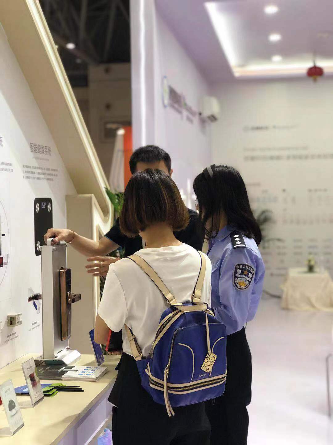 (房慧科技现场工作人员向参展观众介绍智能门锁)